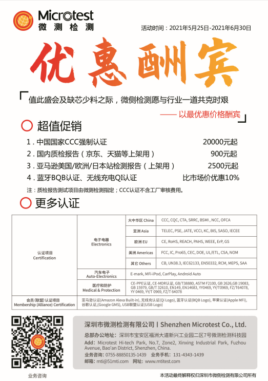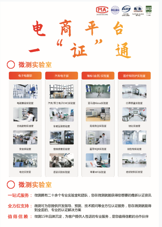 Microtest是國(guó)家CNAS、中國(guó)計(jì)量認(rèn)證CMA、美國(guó)實(shí)驗(yàn)室認(rèn)可協(xié)會(huì)A2LA、無(wú)線(xiàn)充電聯(lián)盟WPC、藍(lán)牙認(rèn)證評(píng)估委員會(huì)SIG、亞馬遜Amazon等國(guó)際機(jī)構(gòu)的認(rèn)可實(shí)驗(yàn)室。Microtest的使命:讓您的產(chǎn)品通全球!