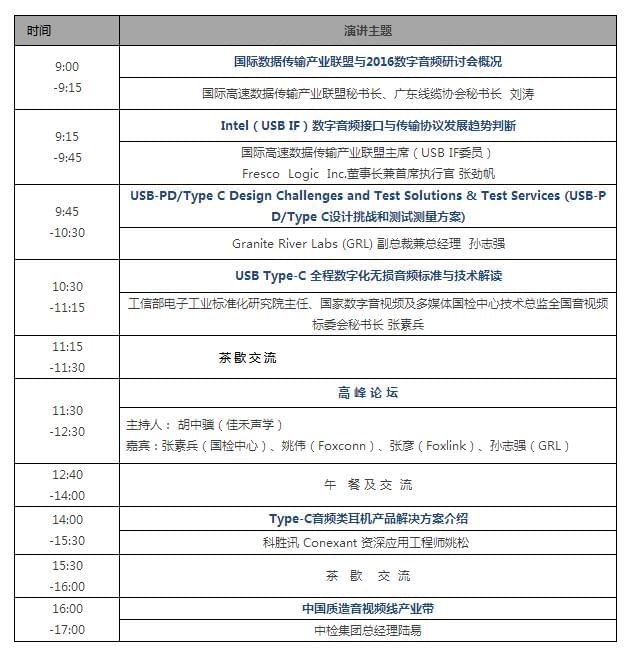 2016數(shù)字音頻接口技術(shù)與未來(lái)趨勢(shì)研討會(huì)將迎來(lái)重量級(jí)嘉賓-國(guó)際高速數(shù)據(jù)傳輸產(chǎn)業(yè)聯(lián)盟發(fā)起人(原Intel網(wǎng)絡(luò)及通訊事業(yè)群工程部首席設(shè)計(jì)師、USB IF 核心委員)張勁帆,Intel\Apple\Google美國(guó)合作實(shí)驗(yàn)室Granite River Labs (GRL) 副總裁兼總經(jīng)理孫志強(qiáng),工信部電子工業(yè)標(biāo)準(zhǔn)化研究院主任、國(guó)家數(shù)字音視頻及多媒體國(guó)檢中心技術(shù)總監(jiān)、全國(guó)音視頻標(biāo)委會(huì)秘書長(zhǎng)張素兵,新增原華為無(wú)線產(chǎn)品線RNC RRM首席工程師胡中驥,科勝訊 Conexant 資深應(yīng)用工程師姚松(熟悉USB界面數(shù)字音頻芯片硬件及軟件相關(guān)設(shè)計(jì))出席本次大會(huì)。