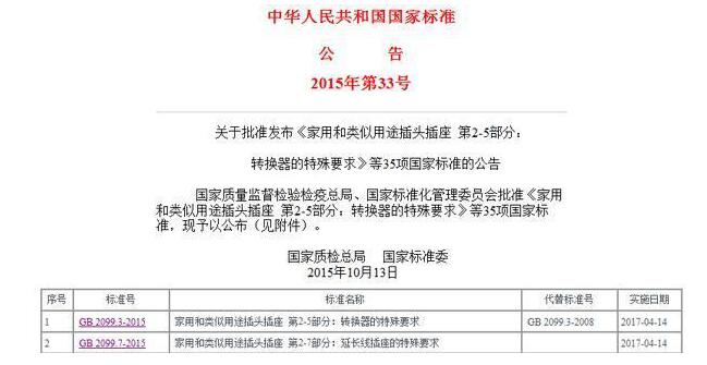 目前插線板行業(yè)俗稱的新國(guó)標(biāo)是指國(guó)家質(zhì)檢總局、國(guó)家標(biāo)準(zhǔn)委2015年10月批準(zhǔn)發(fā)布的GB 2099.3-2015《家用和類似用途插頭插座 第2-5部分:轉(zhuǎn)換器的特殊要求》、GB 2099.7-2015《家用和類似用途插頭插座 第2-7部分:延長(zhǎng)線插座的特殊要求》