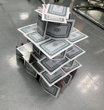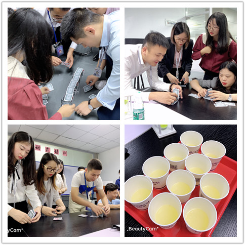 為了讓全體銷售精英擁有更好的狀態(tài),本次的游戲采用團(tuán)隊(duì)PK制,別出心裁,極具挑戰(zhàn)性。銷售精英們分為兩組,隊(duì)員合作動(dòng)手搭建撲克牌塔,最先搭夠5層的組獲得勝利。(輸?shù)慕M要喝檸檬汁,純天然的鮮榨的酸溜溜的檸檬汁哦~~ ,就算輸也讓你能量滿滿!)