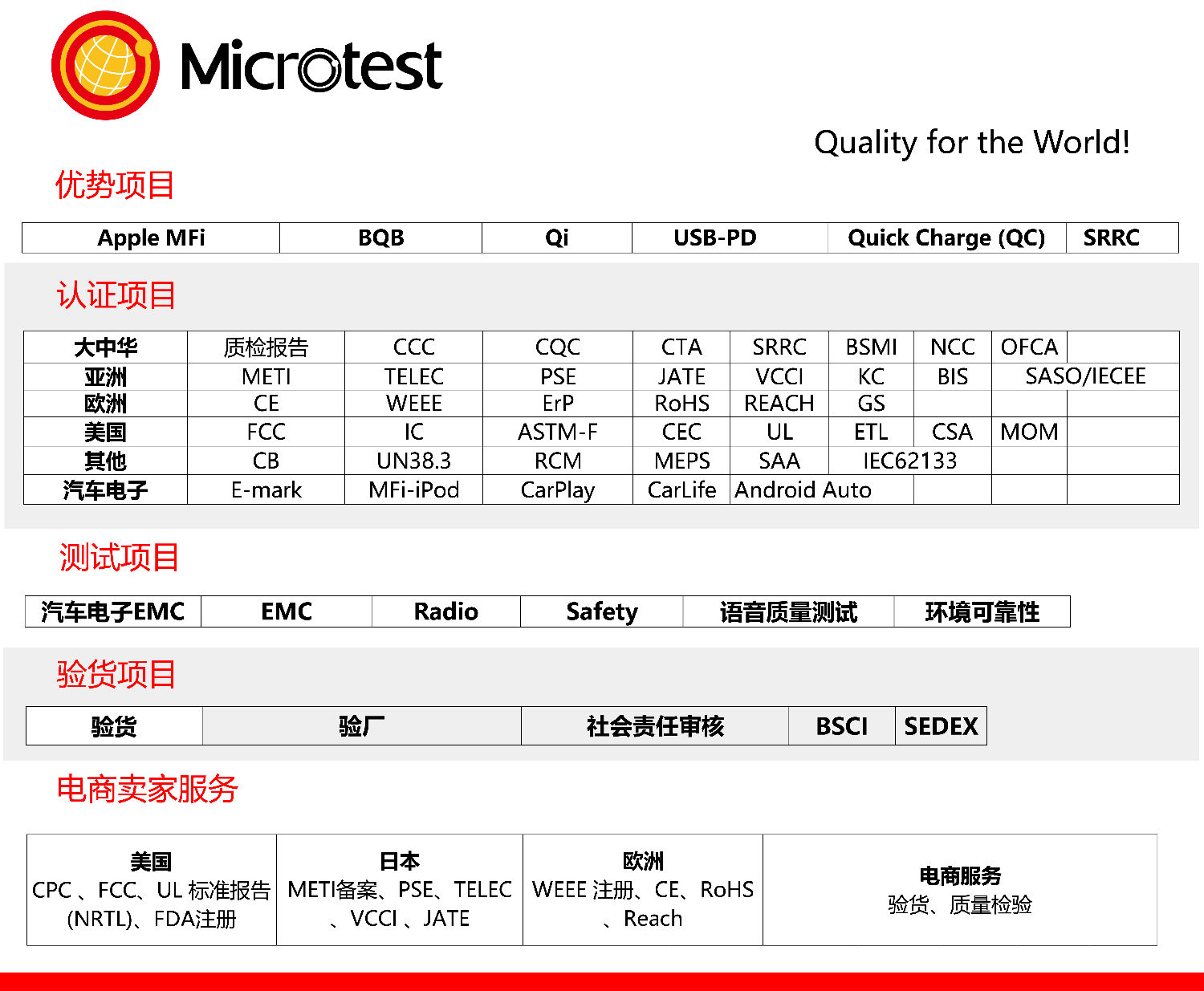 Microtest是國家CNAS、中國計(jì)量認(rèn)證CMA、美國實(shí)驗(yàn)室認(rèn)可協(xié)會(huì)A2LA、無線充電聯(lián)盟WPC、藍(lán)牙認(rèn)證評(píng)估委員會(huì)SIG、亞馬遜Amazon等國際機(jī)構(gòu)的認(rèn)可實(shí)驗(yàn)室。Microtest的使命:讓您的產(chǎn)品通全球!