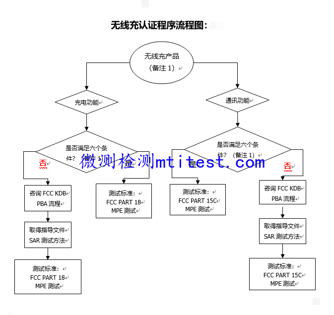 針對(duì)FCC關(guān)于無(wú)線充的認(rèn)證方法,單從標(biāo)準(zhǔn)去研究判斷,確實(shí)不是十分的直觀,為了方便廣大客戶朋友們迅速有效地判斷出自己的產(chǎn)品應(yīng)該采用哪種法規(guī)來(lái)認(rèn)證,微測(cè)檢測(cè)特地制作如下流程圖,供您參考!