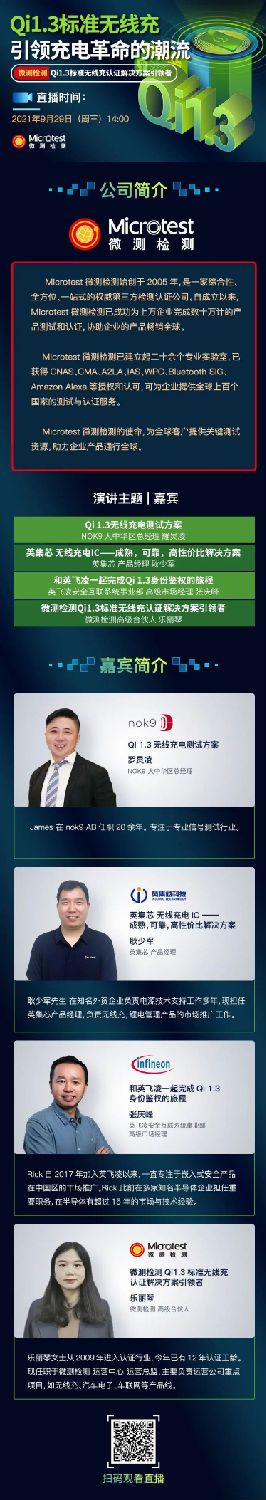 微測檢測于2021年7月22日成功通過WPC Qi 1.3評審,是中國大陸首家獲得無線充Qi 1.3測試能力的ATL實驗室。微測檢測將于2021年9月29日14:00進行《Qi1.3標準無線充引領充電革命的潮流》線上直播,直播中有多位嘉賓進行演講,為您介紹Qi 1.3標準的測試、鑒權、解決方案及認證,是無線充電從業(yè)者不可或缺的重要直播,趕快預約報名參加吧。