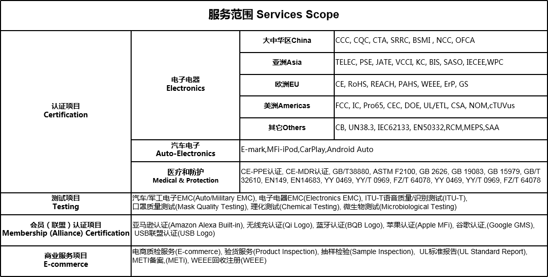 Microtest微測檢測已建立二十余個專業(yè)實驗室,且已獲得中國合格評定國家認可委員會CNAS、中國計量認證CMA、美國實驗室認可協(xié)會A2LA、國際認可服務委員會IAS、無線充聯(lián)盟WPC、藍牙國際聯(lián)盟Bluetooth SIG、亞馬遜Amazon Alexa、國際音頻聯(lián)盟ITU等授權和認可,可為企業(yè)提供全球上百個國家的測試與認證、驗廠與驗貨服務。