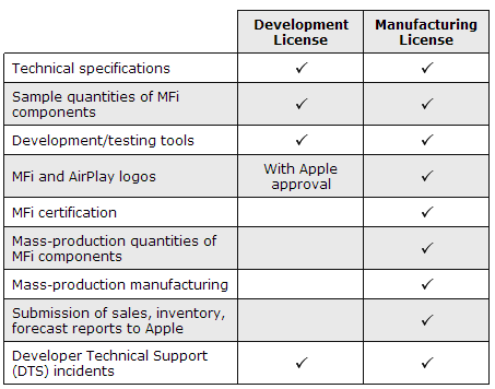 MFI認(rèn)證有兩種類(lèi)型:一個(gè)是研發(fā)許可一個(gè)是生產(chǎn)許可。如果企業(yè)只計(jì)劃去研發(fā)產(chǎn)品或者幫組別人研發(fā)產(chǎn)品而不是生產(chǎn)制造,企業(yè)可以申請(qǐng)MFI研發(fā)許可;如果企業(yè)計(jì)劃生產(chǎn)MFI相關(guān)配件并且擁有自己的工廠(chǎng),企業(yè)可以申請(qǐng)MFI生產(chǎn)許可。下面是兩個(gè)許可的不同特性。