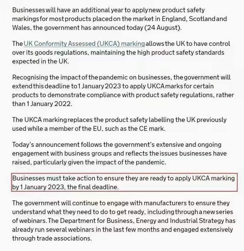 昨日英國(guó)官網(wǎng)發(fā)布關(guān)于UKCA標(biāo)志使用的最新指引,“對(duì)于準(zhǔn)入英國(guó)產(chǎn)品,制造商可在其產(chǎn)品上繼續(xù)使用CE標(biāo)志,截止日為2023年1月1日。2023年1月1日起在英國(guó)市場(chǎng)上販?zhǔn)鄣漠a(chǎn)品必須按相關(guān)法規(guī)標(biāo)有UKCA標(biāo)志”。
