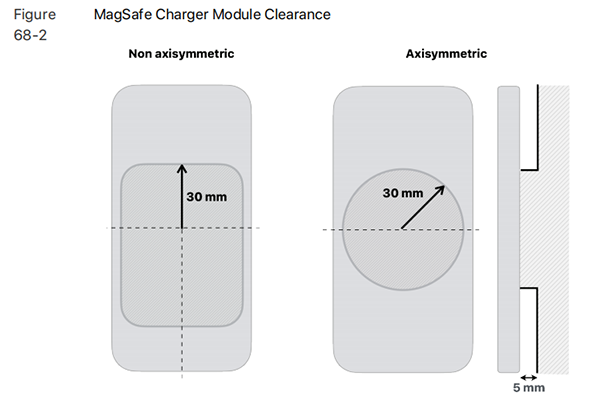 2)對于所有支持的設(shè)備方向,從MagSafe充電器模塊表面的中心到設(shè)備頂部邊緣不超過30mm對于任何超過30mm的的配件,與設(shè)備背面(配合面)保持5毫米的間隙;