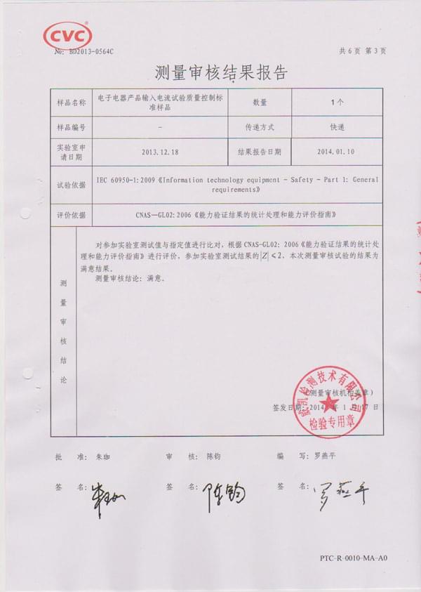 《電子電器產(chǎn)品輸入電流試驗(yàn)質(zhì)量控制標(biāo)準(zhǔn)樣品》測量審核結(jié)果報(bào)告