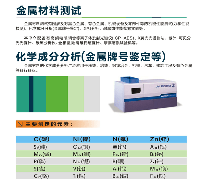 金屬材料測試范圍涉及對黑色金屬、有色金屬、機(jī)械設(shè)備及零部件等的機(jī)械性能測試(力學(xué)性能檢測)、化學(xué)成分分析(金屬牌號鑒定)、金相分析、耐腐蝕性能鹽霧實(shí)驗(yàn)等。