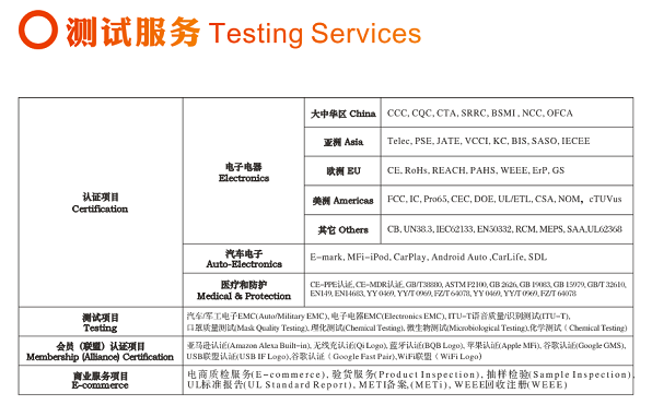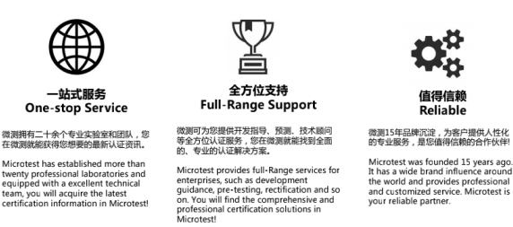 Microtest是國家CNAS、中國計量認證CMA、美國實驗室認可協(xié)會A2LA、無線充電聯(lián)盟WPC、藍牙認證評估委員會SIG、亞馬遜Amazon等國際機構的認可實驗室。Microtest的使命:讓您的產品通全球!